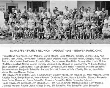 The Schaeffer family's first reunion was held in Milan, Ohio, August 22, 1908 and they have had a reunion every year since except 2020 due to the Covid-19 pandemic. Earlier reunions were held at Seneca Falls, NY, but in 1932 it was decided to move the reunion to Beaver Park, Lorain, OH where the family still meets annually. The family mee